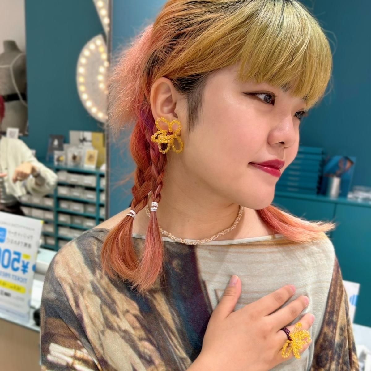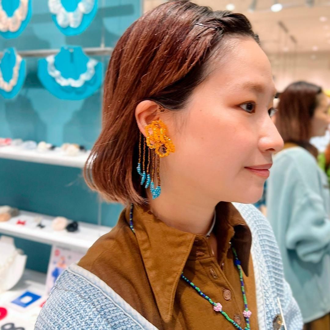 透け感のあるビーズでできた花びらが、ふんわりと広がるフラワーモチーフピアス。
