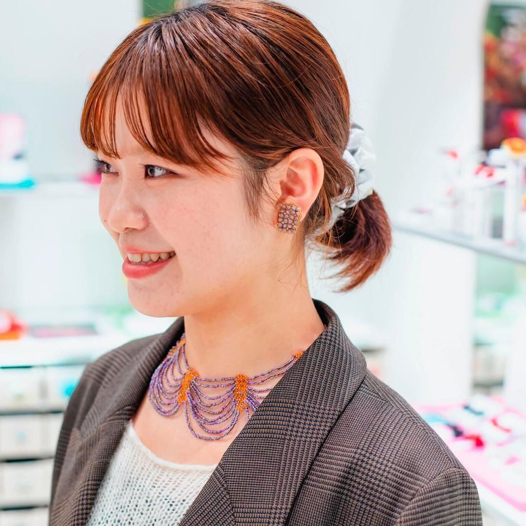 カットビーズが美しく輝き、顔まわりを明るく華やかに印象づけてくれます。