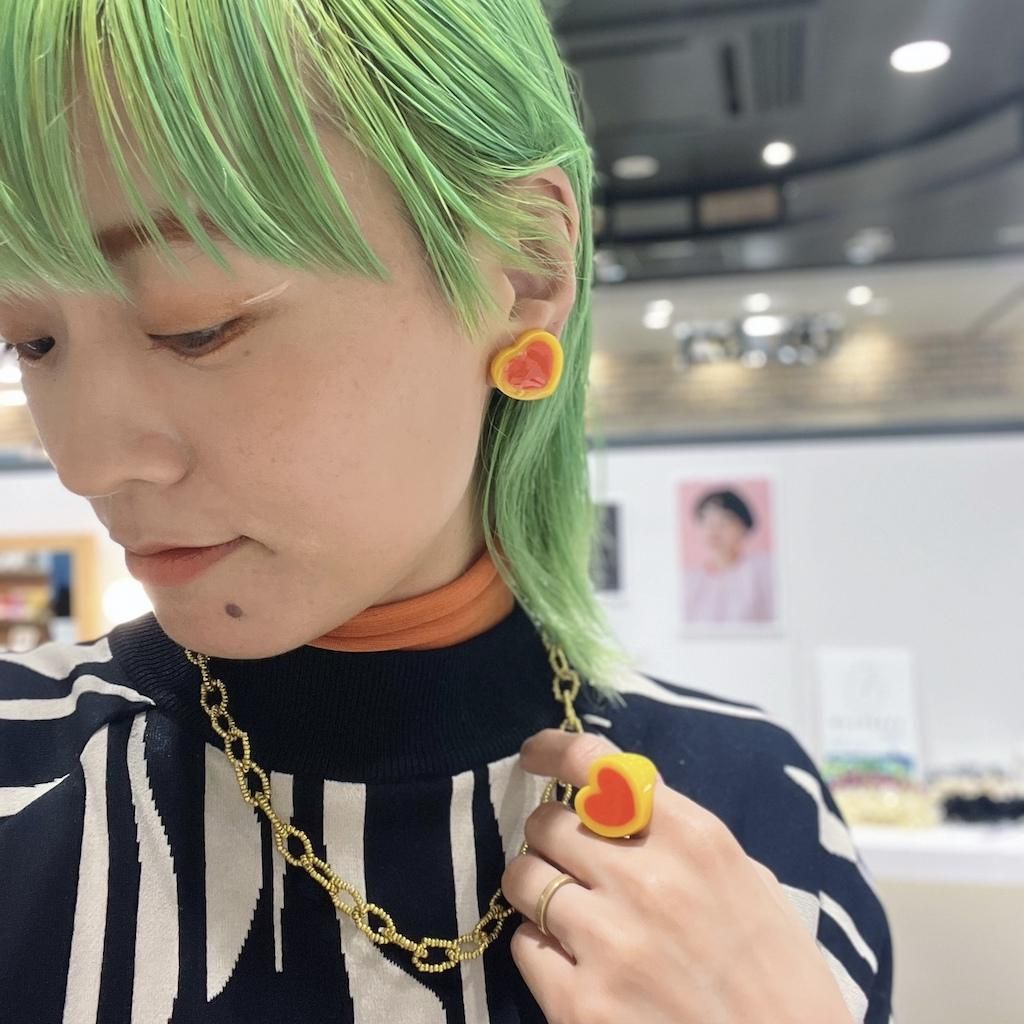 2色のハートが重なり合った、新鮮な印象のハートモチーフピアス。