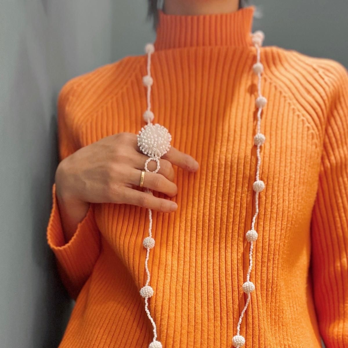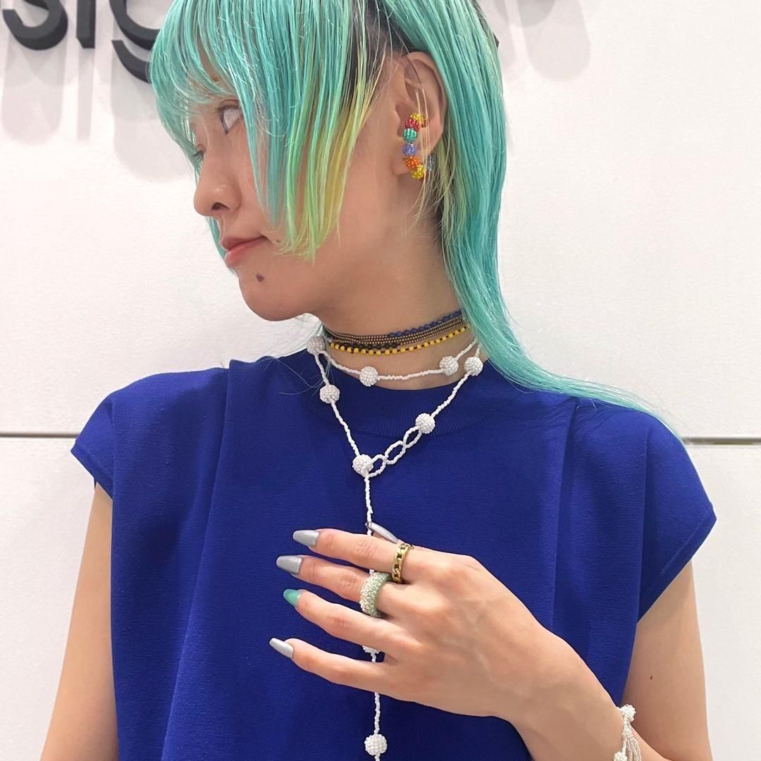 好きなところで留めることができるので2連、3連のほか、ウエストマークにも使える便利なネックレス。カラーバリエーション豊富な上とても軽いので、好きな色を組み合わせた重ねづけもおすすめ。