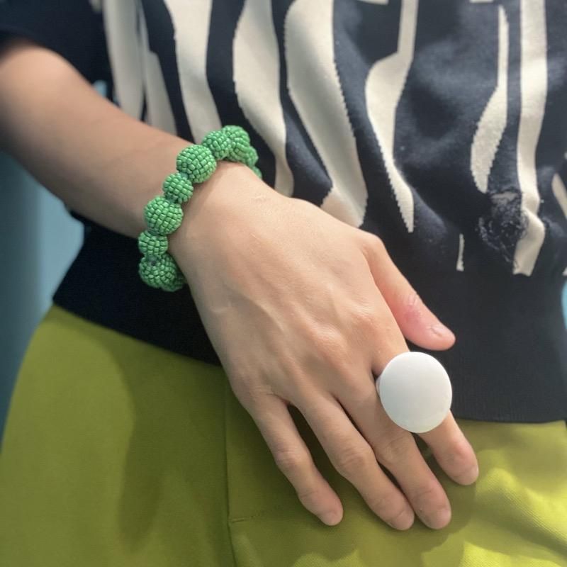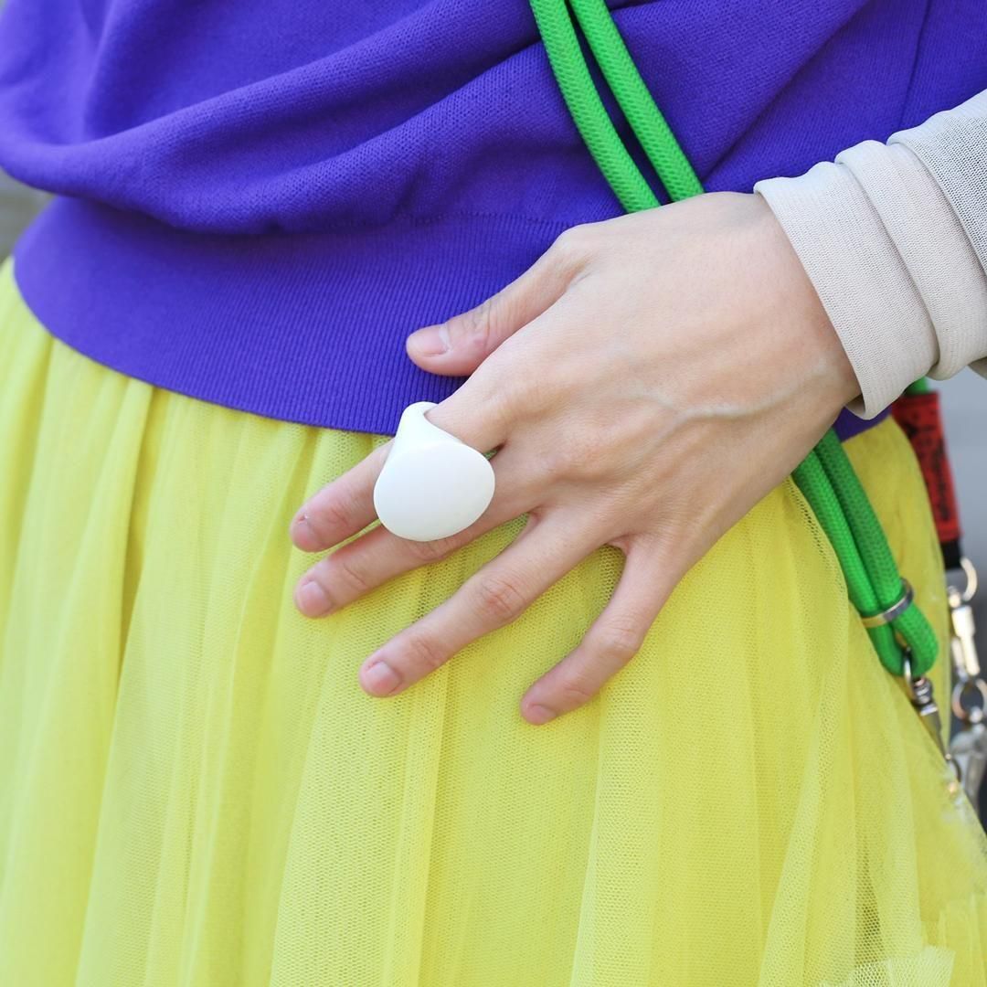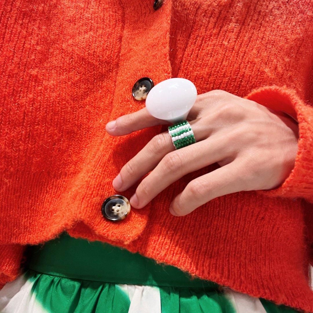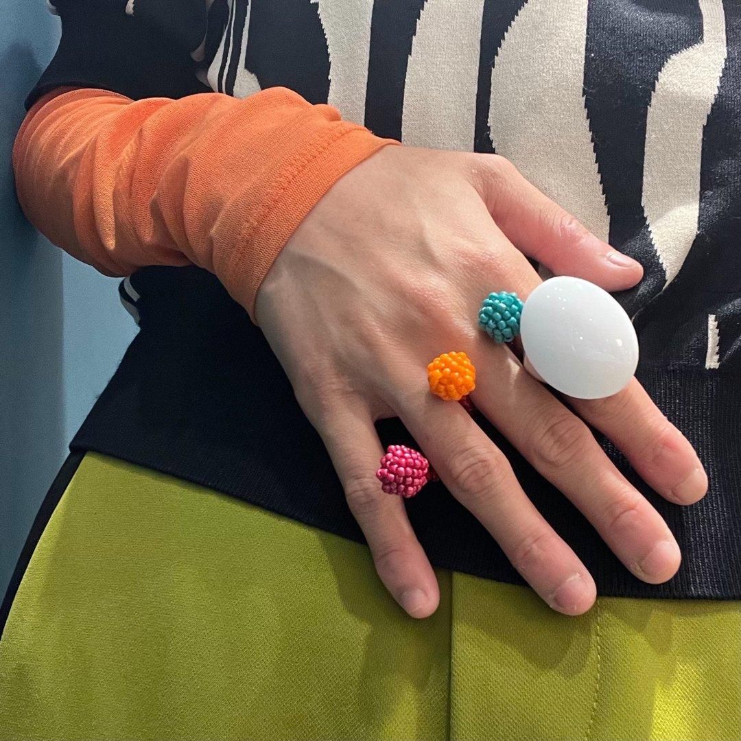 ころんとしたフォルム、美しい発色とツヤが特徴のアクリルレジン製リング。